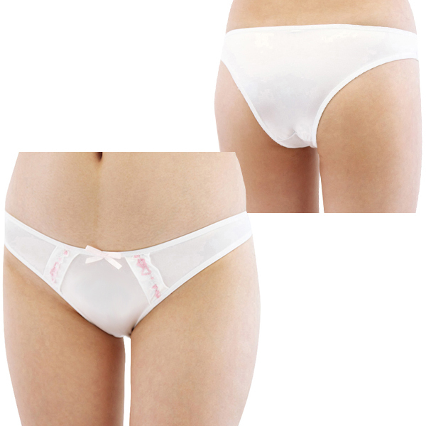 「女性」と言うよりは「女の子」というイメージがぴったりの清純な魅力を持つショーツ。全体の白をベースとして、フロントに軽くアクセントとしてデザインされたレースとピンクのリボンが上品な仕上がりです。