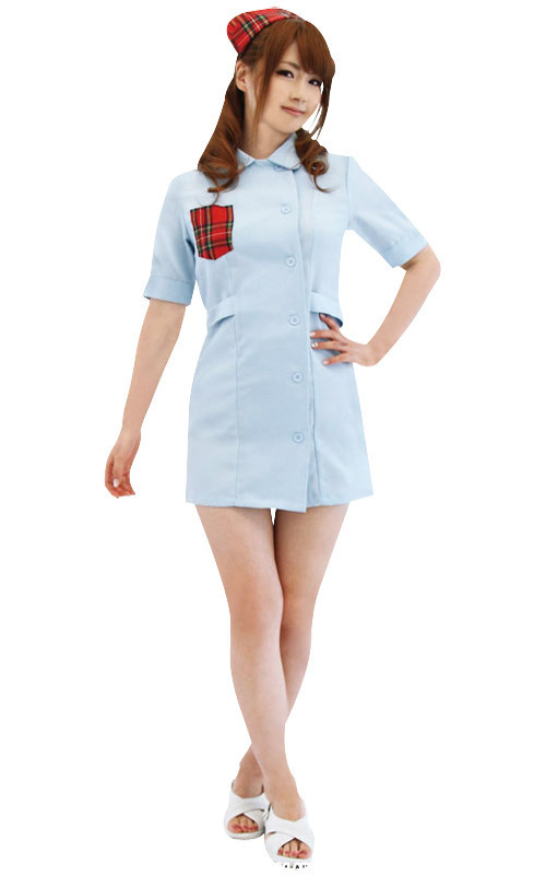 涼しげな水色カラーのナースワンピースに、赤チェックの胸元ポケットを施し、同柄のナースキャップで乙女チックなイメージに!丸襟とボタン仕様がオシャレのアクセントになり、可愛さもグンっとUP!彼もときめくナース風コスチュームです。