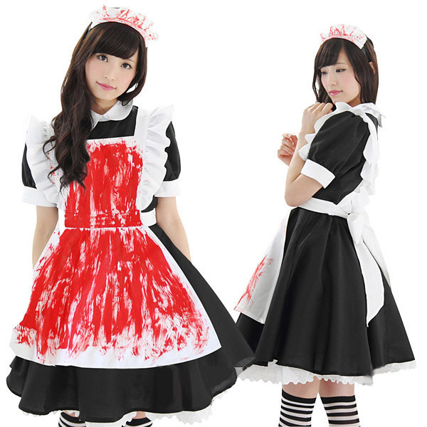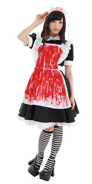 ハロウィンらしさ全開なホラーテイストのメイド服!返り血を浴びてしまったようなたっぷり赤ペイントがおどろおどろしいハロウィン衣装です。