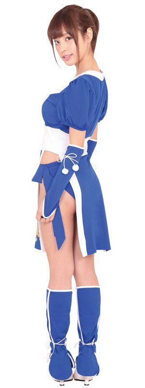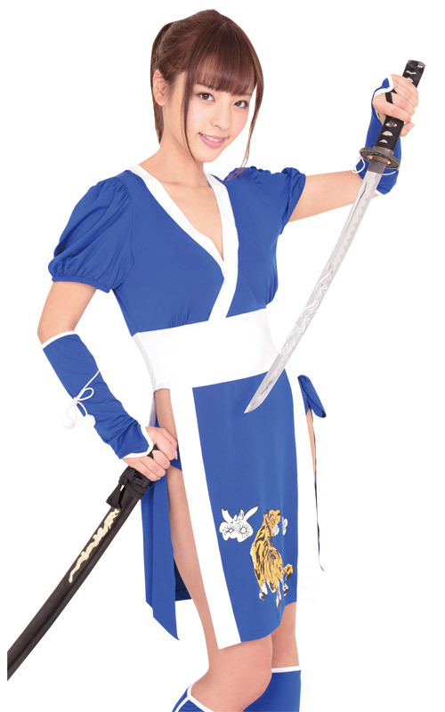●セクシーな「くノ一」装束風セット●凛とした青が美しい帯一体型のワンピース●大胆アレンジのサイドスリット仕様●虎を描いたフロントデザイン●サイドリボン付きの見せパン●雰囲気アップの手甲・脚絆もセット。