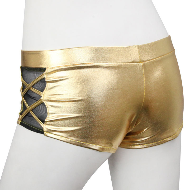 ●メタリックなゴールドカラー●光をキラッと反射するきらめき●ローライズ気味なホットパンツ●両サイドにダブルクロスデザイン●シースルー生地を添えて妖艶に。