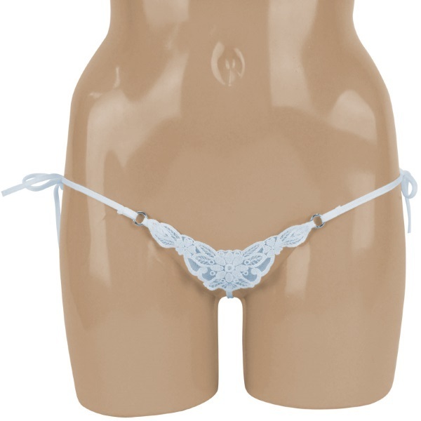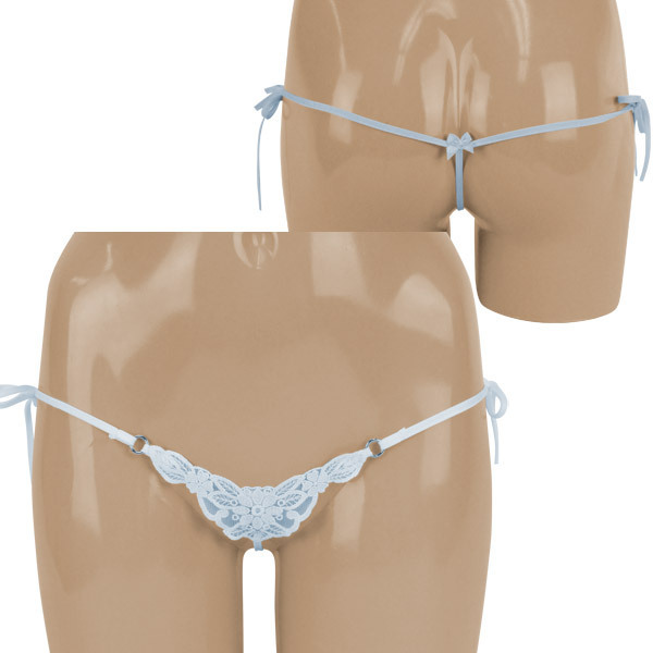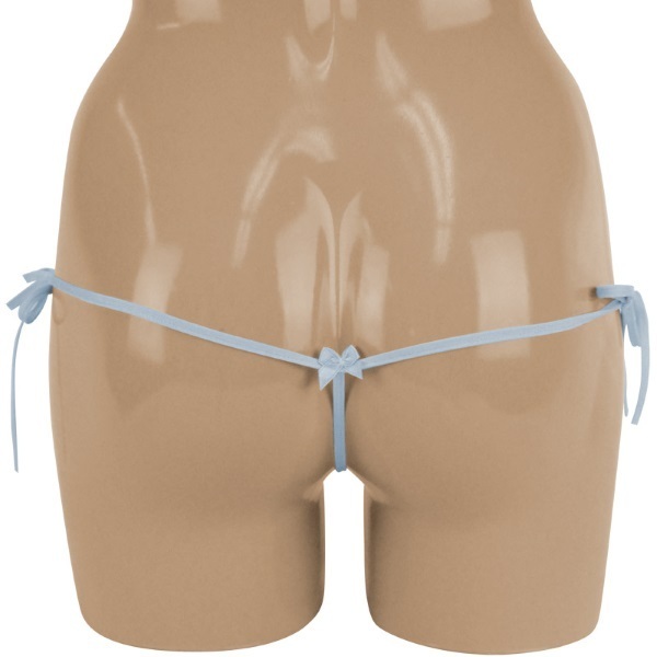 ●爽やかで上品なサックスブルー●フロント部分は繊細レース仕様●両サイドをリボンで結ぶ紐パン●クロッチからヒップにかけては極細ストリング●真後ろ中央に小さなリボン付き。