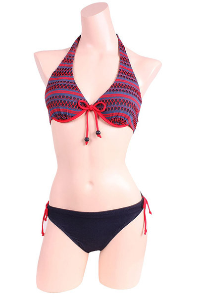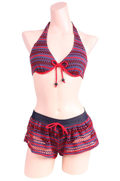 ビーチで周りと差をつける、赤とネイビー本格スイムウェアシリーズ♪ショートパンツありなしで2テイスト楽しめる3点セット。