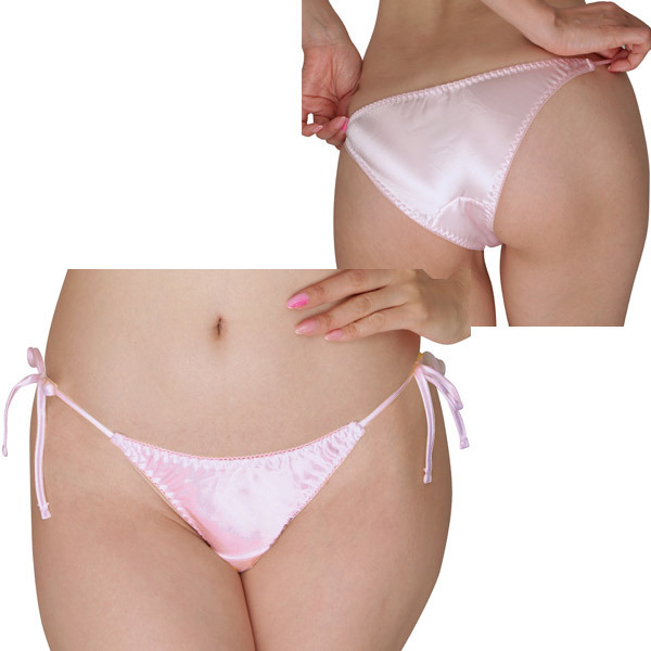 光沢感が美しいサテン生地の女性用フルバックショーツ。両サイドはセクシーな結びヒモ仕様で、結び目をパートナーに解かせる楽しみも!ピンクカラー
