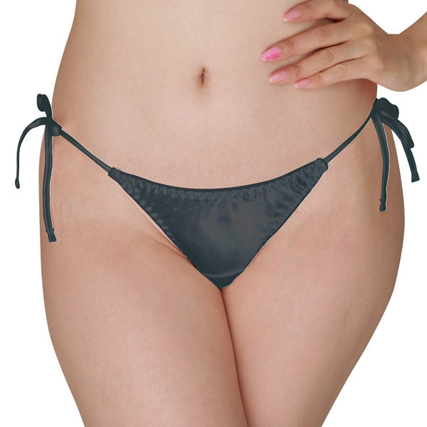 光沢感が美しいサテン生地の女性用フルバックショーツ。両サイドはセクシーな結びヒモ仕様で、結び目をパートナーに解かせる楽しみも!ブラックカラー
