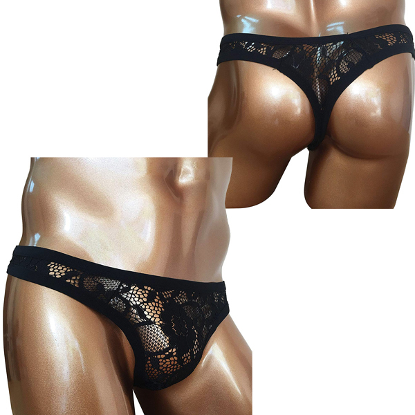 黒の花柄レースが男を華やかに魅せるメンズ用Tバック(ブラック)。