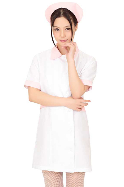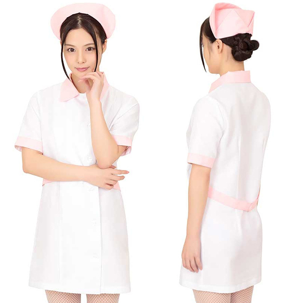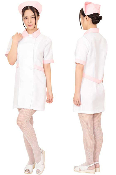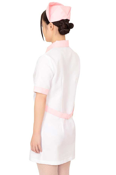 白をベースとしたシンプルなナース服に、優しい淡いピンクカラーをポイントにしたミニ丈ナース服。
