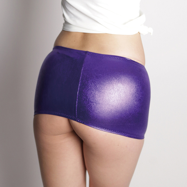 伸縮性のあるメタリック生地がヒップラインを際立たせるマイクロミニのタイトスカート。生地特有の光沢感が曲線を強調し艶めかしいボディを演出!パープルカラー、Mサイズ