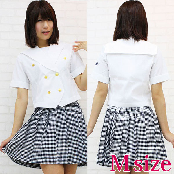 Mサイズ:B78〜88cm・W58〜73cm 丈:上着47cm(袖丈22cm、肩幅36cm)・スカート46.5cm セット内容:上着(ピケ生地使用、前ボタン留め、金ボタン、左袖に校章付き)・スカート(横ファスナー、アジャスター有り、黒ギンガムチェック生地)