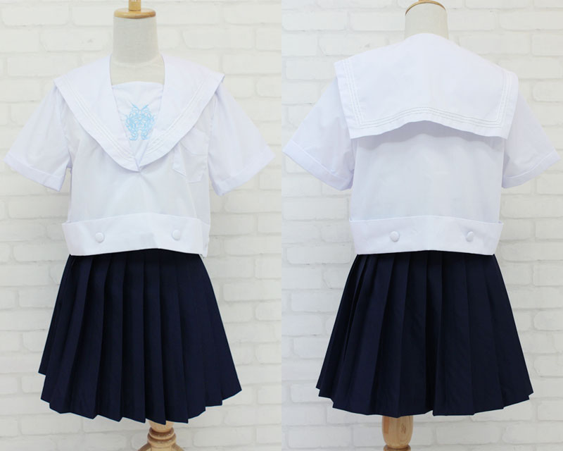 胸元にある水色の刺繍が涼やかな、白セーラー&濃紺スカートの制服コスプレセット。