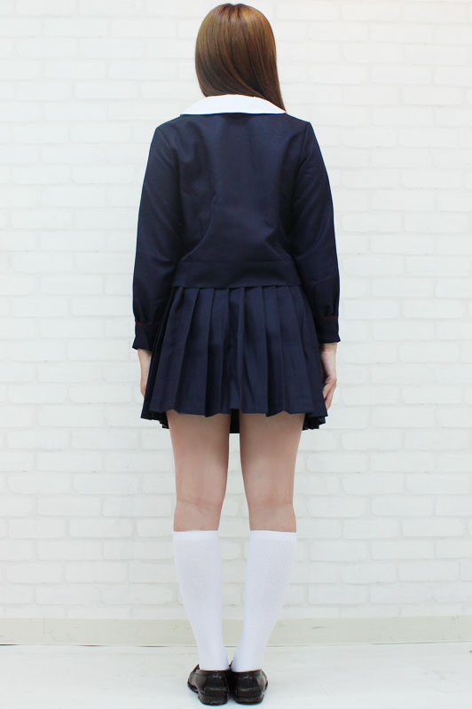 白襟とエンジ色のスカーフがベストマッチ!可愛い濃紺の制服コスプレセットです。