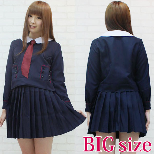白襟とエンジ色のスカーフがベストマッチ!可愛い濃紺の制服コスプレセット(BIG)。