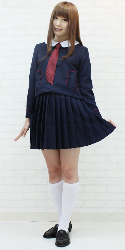 丸首が可愛い冬服タイプのトップスはサイドファスナー仕様、白襟はスナップボタンで取り外し可能!トップス両サイドにはエンジ色のパイピングの中に、6つのボタンをあしらった飾りポケット付き!プリーツスカートはアジャスターで調節可能です。