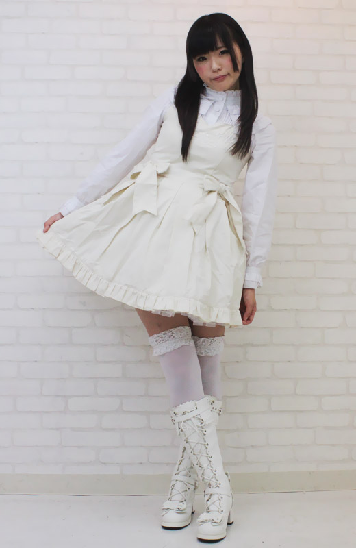 ふんわりフリルが可愛いロリータ服!クラシカルで上品なオフホワイトのジャンパースカート&長袖ブラウスセット(M)。