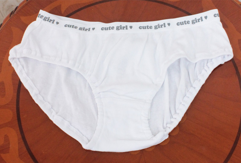 プリティガールに変身!純白リブ編み仕様の綿パンツ単品(M)。