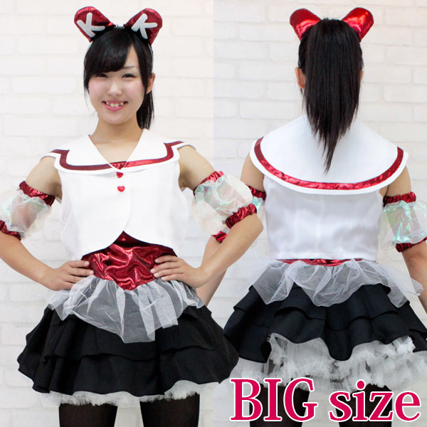 赤を基調としたハートボタンの上着、インナー、黒のティアードスカート、パニエ、アームカバー、カチューシャの鉄板セット!憧れのアイドルになりきれちゃうコスプレ衣装です。