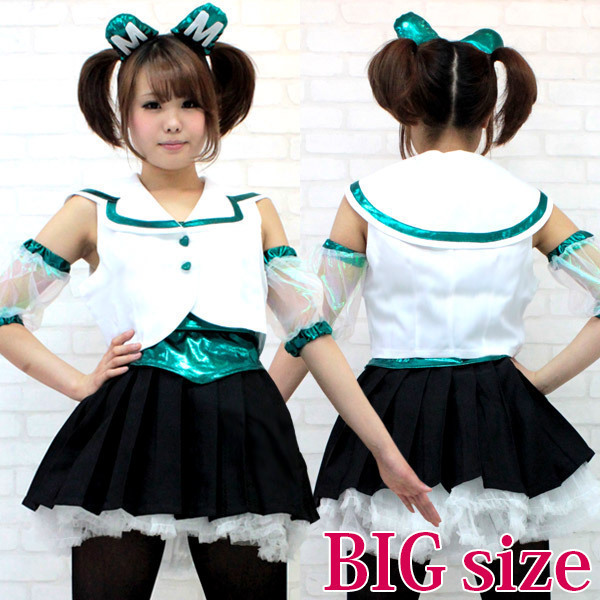BIGサイズ:B88〜97cm・W68〜82cm 丈:上衣44cm(肩紐34cm)・インナー前身頃丈:45cm・スカート38cm・パニエ40cm・アームカバー(腕囲)約38cm セット内容:上衣(前ボタン)・インナー(サイドファスナー)・スカート(ボタン留め、一部ゴム入り)・パニエ・アームカバー・カチューシャ