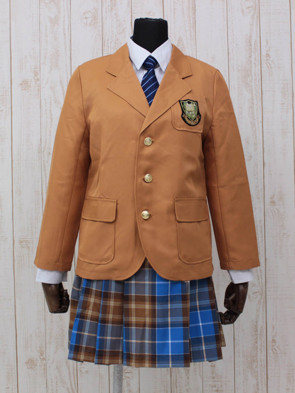 キャメル色ブレザーと青チェックスカートがクラシカルな冬服タイプの制服コスチューム。