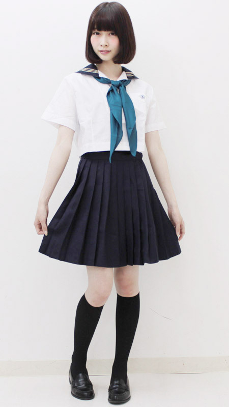●3本ラインの紺襟がキリッとかっこいい半袖セーラー●左胸のポケットには校章風の刺繍入り●襟元の白い切り替えと青緑のスカーフがベストマッチ●膝丈のシンプルな濃紺プリーツスカート。