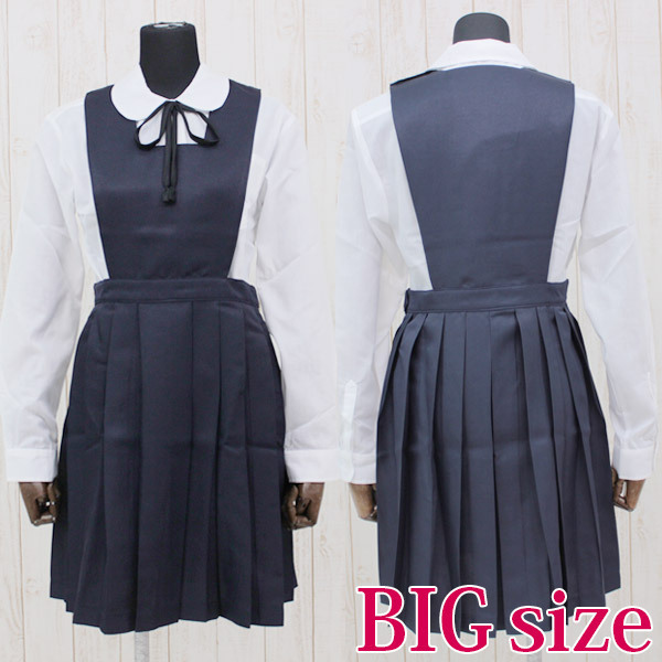 BIGサイズ:B〜116cm・W〜97cm ブラウス:着丈78cm・袖丈64cm・肩幅50cm・首周り43cm・手首周り24cm ジャンパースカート丈97cm 紐タイ130cm セット内容:ブラウス(丸襟、前ボタン留め)、ジャンパースカート(上半身裏地付き、左肩とウエストにスナップボタン有り、ホック着脱可)、紐タイ