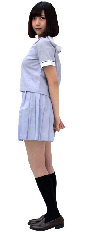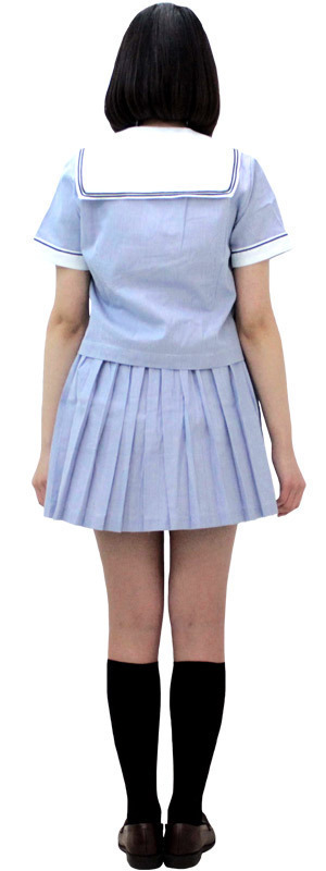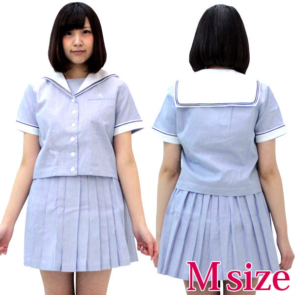 ●Mサイズ:B〜95cm・W〜72cmに対応●淡いブルーカラー●トップス:スナップボタン&前開きボタン留め(胸ポケットあり)●セーラー襟&半袖にライン入り(夏制服タイプ)●プリーツスカート:サイドファスナー&3段ホック留め。