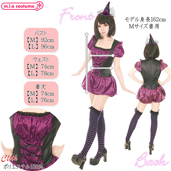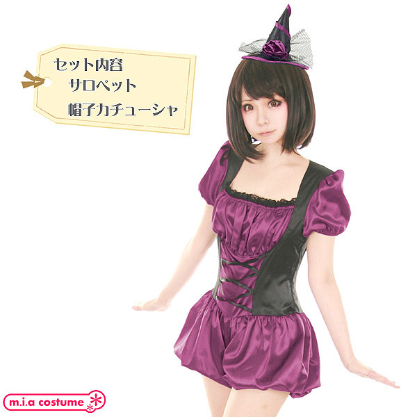 小さな三角帽子がチャーミング♪サテン風の艶やかな生地を使用した、黒×パープルのダークポップな可愛い魔女コスプレ。
