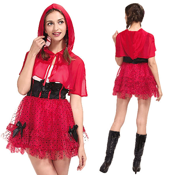 一味違った赤ずきんコスプレで周りと差をつける!ドット柄のチュールスカートと黒リボンで可愛く仕上げたコルセット風ミニスカワンピース。