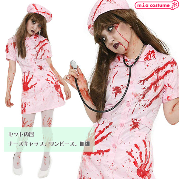 ハロウィン大人気のゾンビなナースになりきろう♪ワンピース、ナースキャップ、血糊がセットになった3点セット。