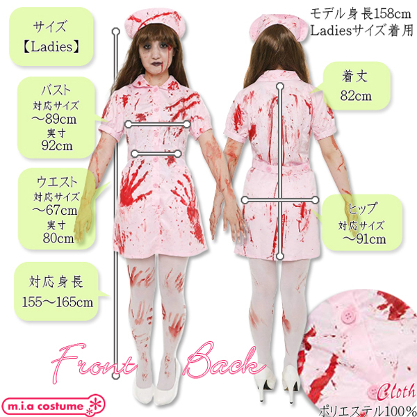 Ladiesサイズ:B〜89cm・W〜67cm・H〜91cm・身長155〜165cm・着丈82cm セット内容:ナースキャップ、ワンピース(前ボタン)、血糊 素材:ポリエステル100%