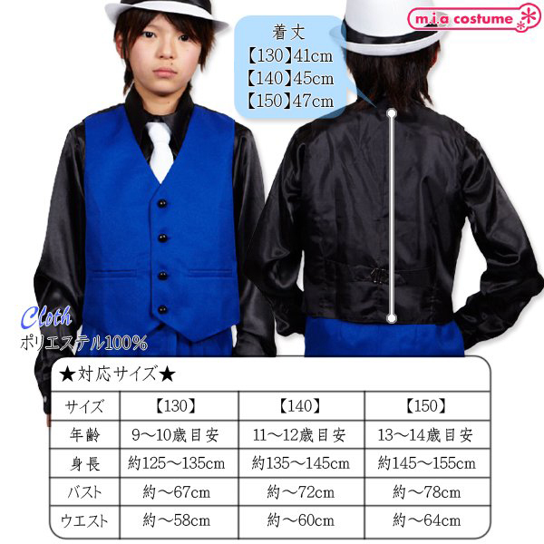 130サイズ 対応サイズ:身長125〜135cm・B〜67cm・W〜58cm 実寸:着丈41cm セット内容:ベスト単品(前ボタン) 素材:ポリエステル100%