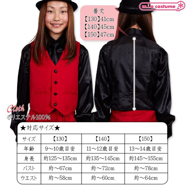 140サイズ 対応サイズ:身長135〜145cm・B〜72cm・W〜60cm 実寸:着丈45cm セット内容:ベスト単品(前ボタン) 素材:ポリエステル100%