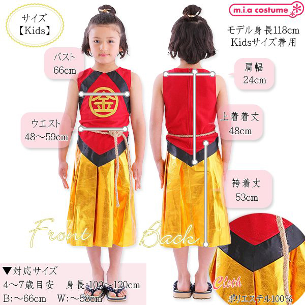 ありそうでなかった金太郎のコスチュームです♪胸の部分の「金」の刺繍が本格的で高級感があります!袴風スカートはウエストゴムで着脱も簡単♪寒い日はインナーを着用し、ベスト風に着てもかっこいいですよ。