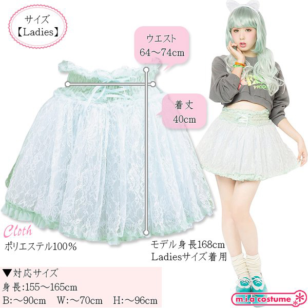 対応サイズ:身長155〜165cm・B〜90cm・W〜70cm・H〜96cm 実寸:W64〜74cm・着丈40cm セット内容:スカート単品(ウエストゴム) 素材:ポリエステル100% モデル身長168cm