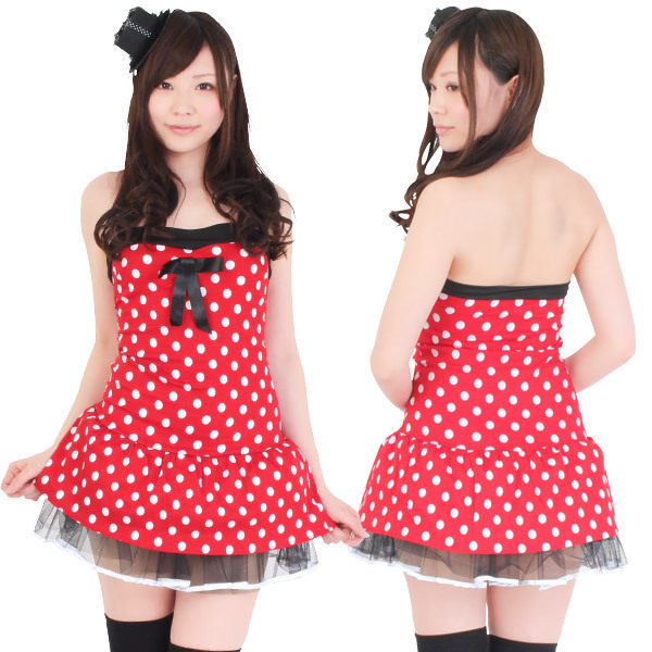 赤地に白のドット柄がとっても可愛いミニーチューブトップ!セクシーな肩出しワンピースの胸中央にある黒いリボンが、さらに可愛さを引き立たせます!スカート部分は女の子らしいチュール素材でふんわりと仕上げたコスチュームです。