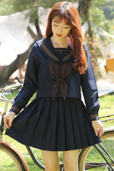 クラシックなデザインが知的な印象を与える紺色の長袖セーラー服。