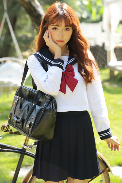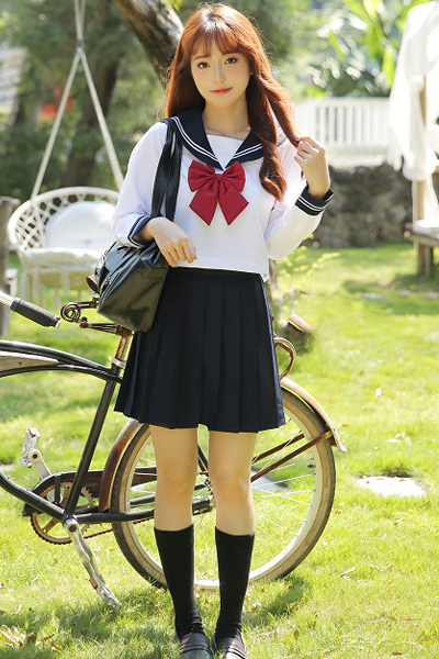 清潔感溢れる紺と白の制服を、真っ赤な大きいスクールリボンで華やかに魅せた長袖仕様のセーラー服。